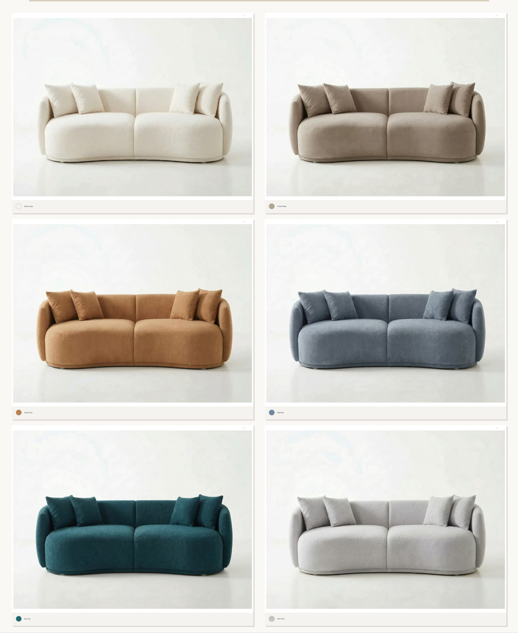 Caramel Tan, Dark Teal, Silver Grey, Slate Blue, Taupe Greige, White Cream |