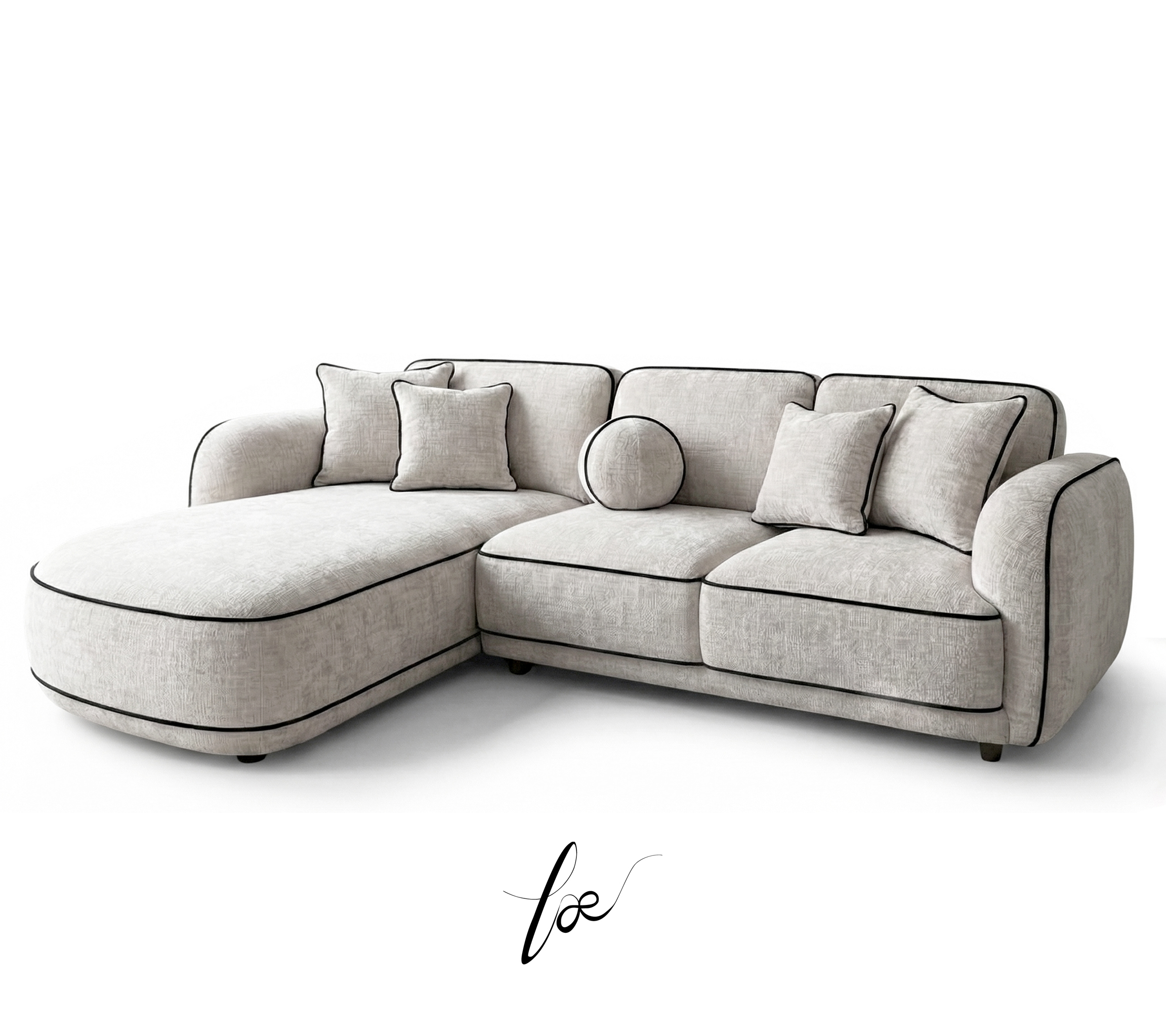 Every curve of the Elysian Sectional Sofa has been meticulously planned to offer a balanced aesthetic. The contrast between the light fabric and the dark piping highlights its architectural form, while the oversized chaise invites you to lounge in luxury. Whether you are hosting a formal gathering or enjoying a quiet evening, this sofa provides the perfect environment for relaxation.
